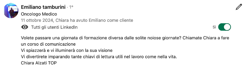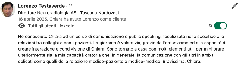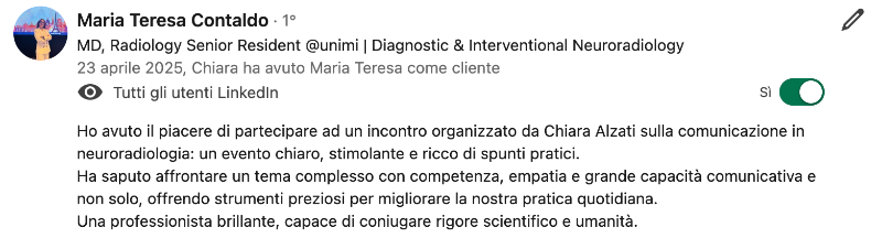 Pensata per ispirarti attraverso l’esperienza di tuoi colleghi e offrirti una visione concreta su come strutturo i miei workshop per medici.