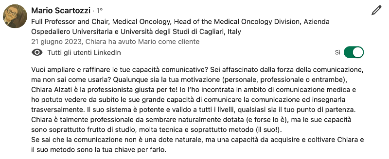 Mario Scartozzi è il coautore di questo libro. La sua esperienza nel campo della comunicazione scientifica lo rende la persona ideale per affiancarmi in questa indagine sul Public Speaking. Primario di Oncologia presso l’ospedale Duilio Casula di Cagliari, Mario unisce la precisione e il rigore della ricerca medica alla capacità di trasmettere concetti complessi in modo chiaro e coinvolgente.